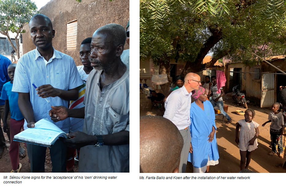 Mr. Sekou Kone is happy he can now provide his family with cheap and easy accessible water: “It was frustrating to see the drinking water network coming so close to my house, but not being able to benefit from it. The initial investment of 155.000 CFA is just too high for me. With the support of Putrenovatie.nl I now have not only easier access, but also cheaper and cleaner water”(because the risk of contamination during transportation from the public tap to home is reduced).