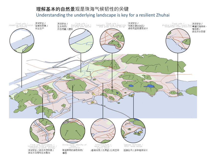 Together with Palmbout Urban Landscapes we collaboratively wrote a 'consulting report for guidelines, principles and process for a resilient Zhuhai' that showcases the Dutch approach and shares new findings in the form of strategies and case studies. The report was written based on the findings gathered during three missions in 2018 and 2019.Figure 1: Example of relevant landscape typologies for Zhuhai